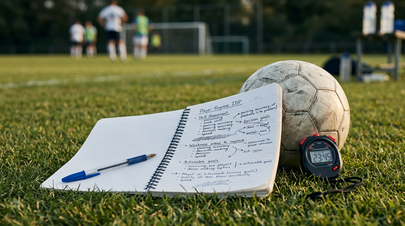 The framework (assess, set goals, train, review) is the same. The content changes. U8 IDPs are simple: "Build ball comfort. Touch the ball every day." U14 IDPs are more detailed, with position-specific goals and physical benchmarks.