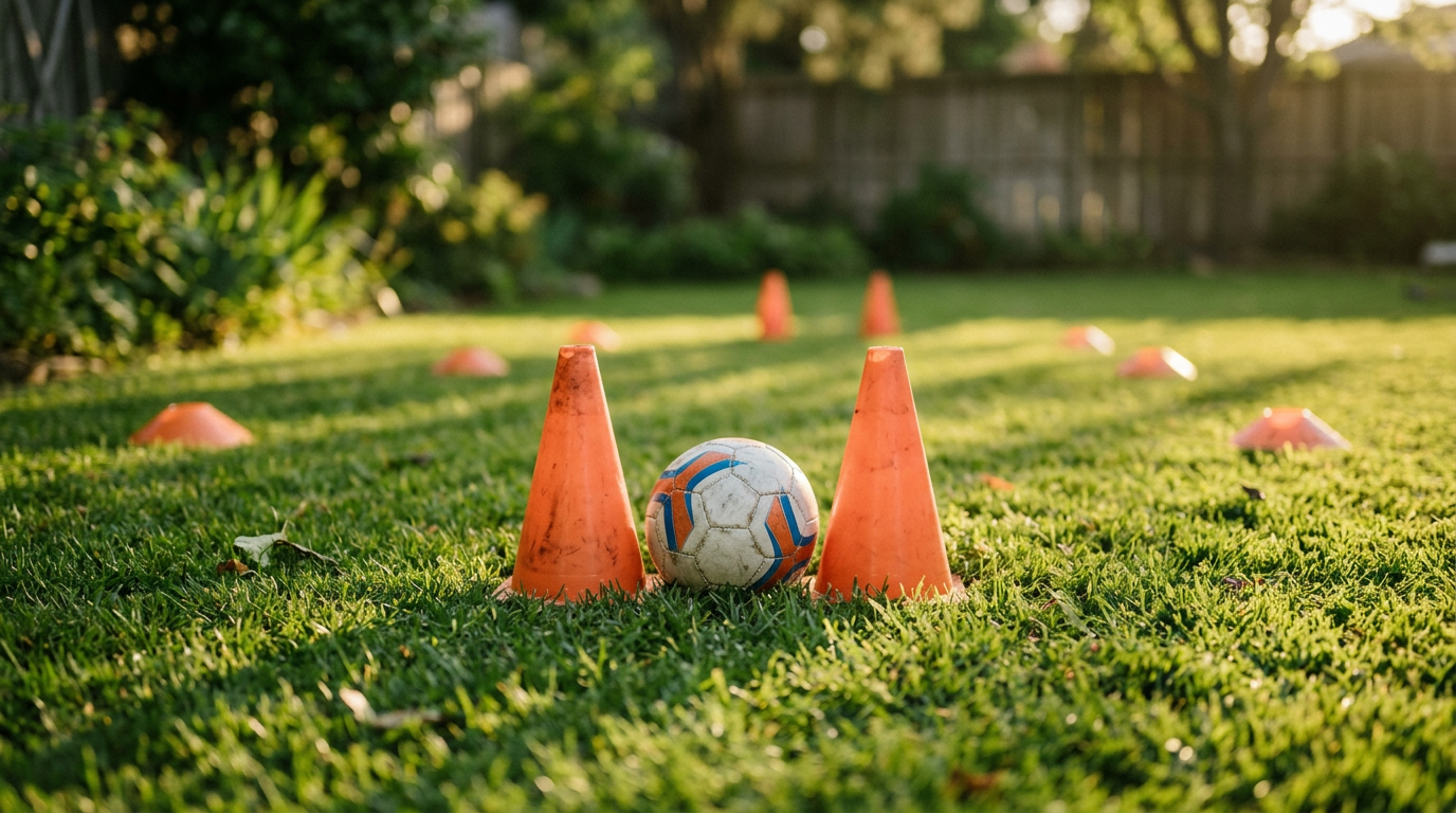 Make it a competition. Time the cone slalom and try to beat yesterday's score. Count how many direction changes in 30 seconds without losing the ball. Any measurable challenge turns practice into a game.